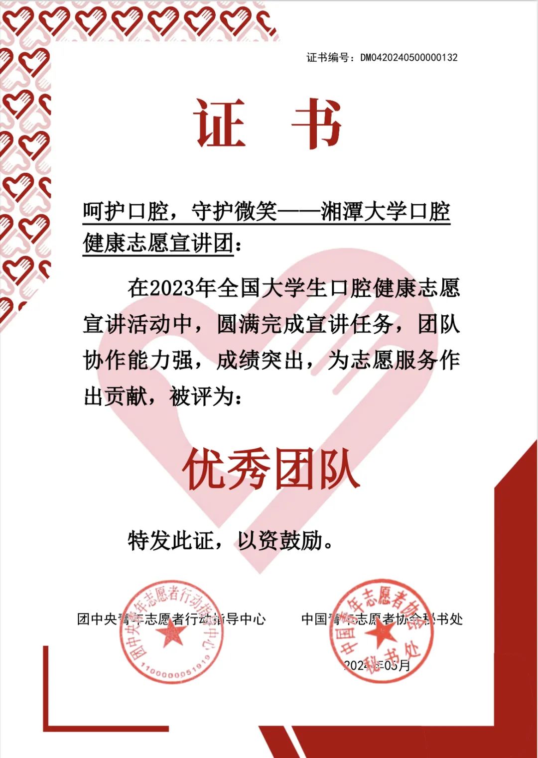 我院“呵护口腔,守护微笑口腔健康志愿宣讲团”在全国大学生口腔健康志愿宣讲活动中,圆满完成宣讲任务,团队协作能力强,成绩突出,为志愿服务作出贡献,获得“优秀团队”的荣誉称号。