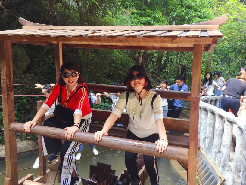 中午稍事休息后,大家又乘车来到皇龙大峡谷,大家一起体验了踩 “浮动梅花桩”,过“双龙潭”,勇渡“铁索桥”、爬“壁虎网”、“ 滚木桥”、“ 云梯” 等近20个拓展项目。峡谷内古藤老树、奇山怪石、鸟语花香随处可见,瀑布飞溅,置身其中犹如进入绿色乐园。大家还一同体验了5D玻璃桥和滑梯项目,感受了玻璃破裂声效带来的惊险刺激乐趣。